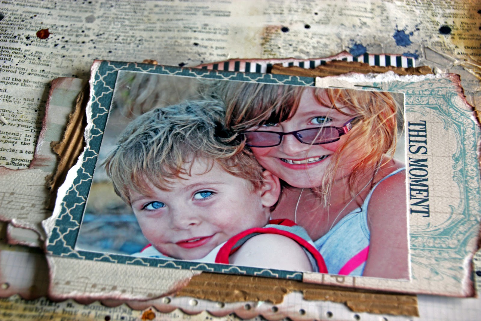 Assemble your collection into a pile of an appropriate size to mat your photo with lots of different patterns, shapes and textures peeping out between layers. Ink and distress the edges of the papers if desired.