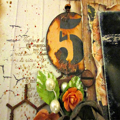 I started by giving the paper a decorative edge with a border punch. Then using the stamp from the kit I randomly stamped around where my design was going, and then I added some splatters of the Heirloom Gold mist. I distressed the layers and cut out a couple of the post cards from one of the papers, which I distressed then tucked under the photos. Then I created a tag to tuck under the other side. Next I added a couple flower clusters around the photos. I colored the holly flourishes with the Heirloom Gold mist and added ruby stickles for the berries. I cut one of the metal elements from the kit in half and added them to the clusters. Then as a finishing touch I added a few more splatters using Smooch in Siren and in Green Apple.
